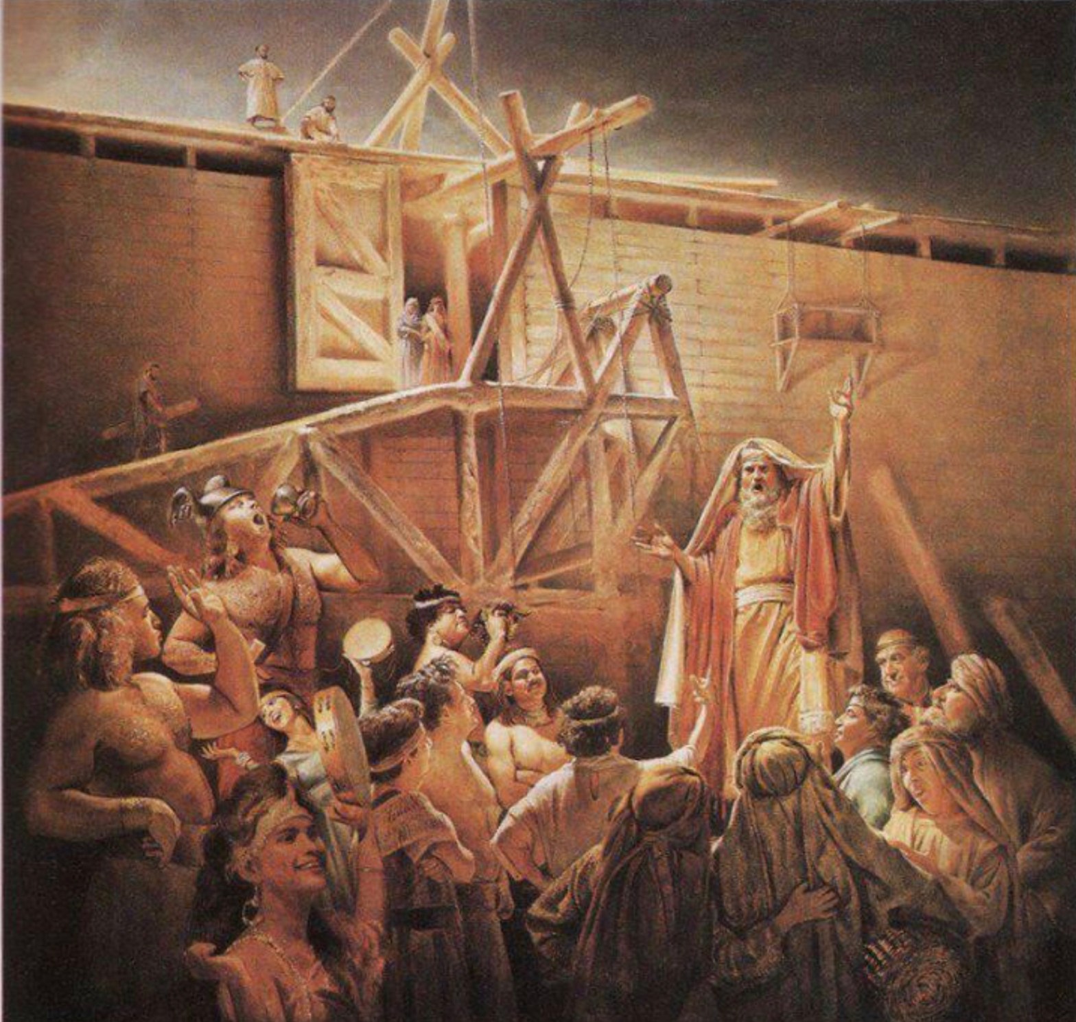Noah spent 120 years building the Ark. As a prophet, he warned the people of his day of a coming deluge. Prior to this time, it had never rained. Every evening, dew came from heaven and wetted the ground. The whole Earth was of one weather, subtropical. The Ark could not have been built by Noah and his three sons alone. He probably hired men to help him build the Ark. They received wages to help him build the Ark but did not enter into the Ark. They must have mocked him while he built the Ark, and spoke of a coming deluge. They must have thought that old age was taking its toll on him, though he was not the oldest man alive in his day. Methuselah was still alive then, and died shortly before the deluge. Had they not believed in evolution, had they believed in God, they would have believed in divine intervention: they would have believed the teachings of Noah, and taken his warning seriously.