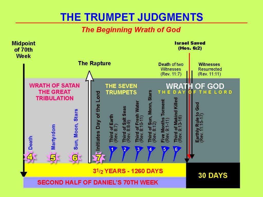 seventh trumpet involves no judgement of its own, but opens into the seven bowls. Therefore the seventh seal alone contains both the seven trumpets and the seven bowls. When the seventh seal is broken(Rev.8:1), the seven trumpets and the seven bowls will progressively unfold. They are part of a comprehensive whole. Collectively, the seven trumpets and the seven bowls are God’s Day Of The Lord wrath, the final climatic, comprehensive and consummative eschatological judgment. The last trump is the same as the seventh seal. The Rapture occurs at the last trump(1Cor.15:51-52). The rapture also occurs at the breaking of the seventh seal, immediately prior to the commencement of the outpouring of the wrath of God.