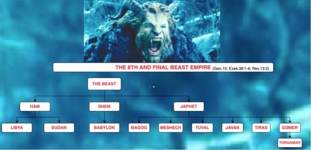 Although, the Eighth And Final Beast Empire, the Revived Roman Empire, The Fourth Reich will consist of the descendants of Ham, Shem, and Japheth, the Japhethites will dominate through Magog, Meshech, and Tuval, the three power base nations coalition. These are the three primary nations. The seven secondary nations which are Arab and or Islamic encircle Israel and come from Ham, Shem, and Japheth. These are the ten horns of the nondescript beast of Dan.7:7 and Rev.13:2.